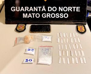 Com base na informação, a equipe realizou buscas no terreno indicado, onde foi localizada uma mochila contendo uma porção grande de substância análoga à cocaína, três porções médias da mesma substância, 35 invólucros pequenos de cocaína, fracionados para venda e uma porção média de substância análoga à pasta base de cocaína.