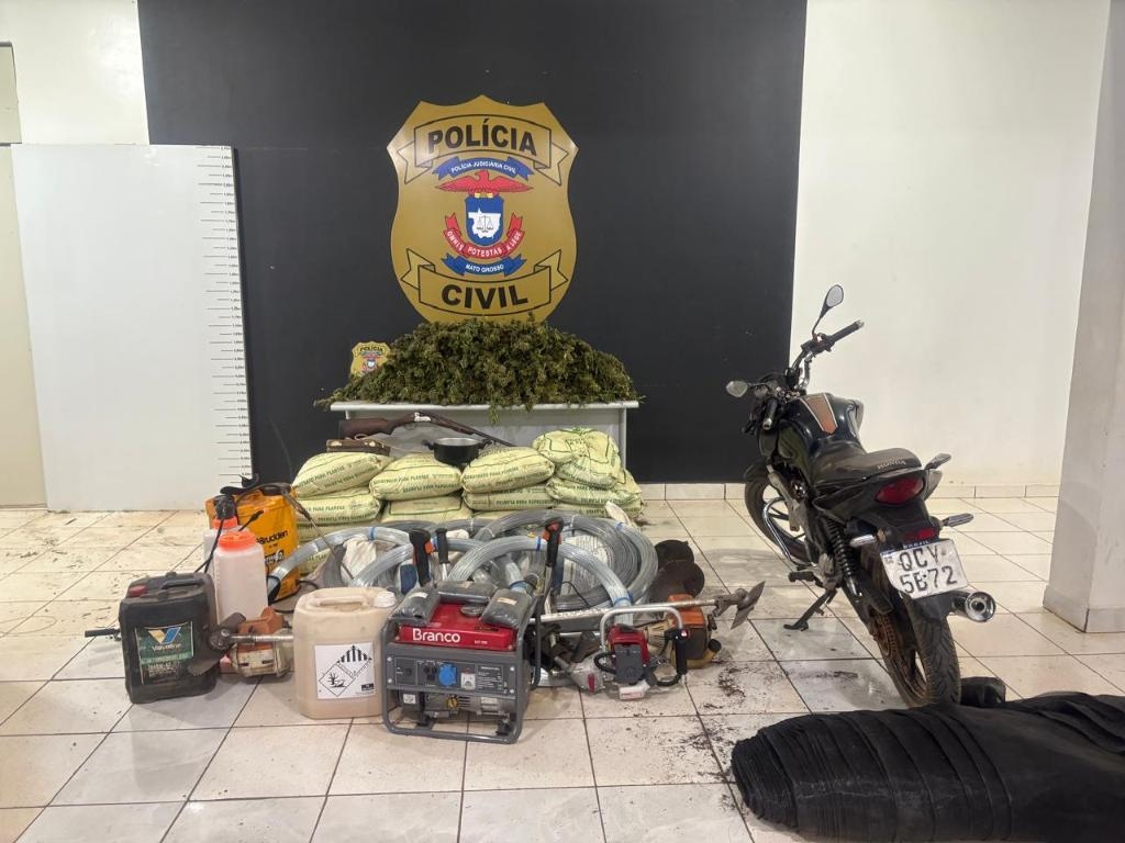 Foram apreendidos objetos com relação direta entre os barracos e a plantação (perfurador de mourão, broca, arame, inseticida, plantas encontradas em panela). Todos os materiais e os dois suspeitos foram apresentados na 1ª Delegacia de Tangará da Serra.