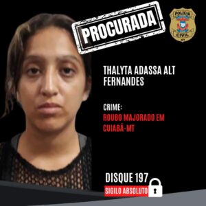 A mulher, identificada como Thalyta Adassa Alt Fernandes, de 28 anos, está com a prisão decretada e é procurada pela Polícia Civil.