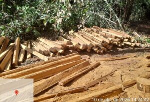 No local, os policiais encontraram toras de madeira derrubadas e outras serradas. Ao entrar na mata, a equipe avistou um acampamento com dois suspeitos, de 42 e 57 anos, que disseram terem sido contratados para executar um serviço.