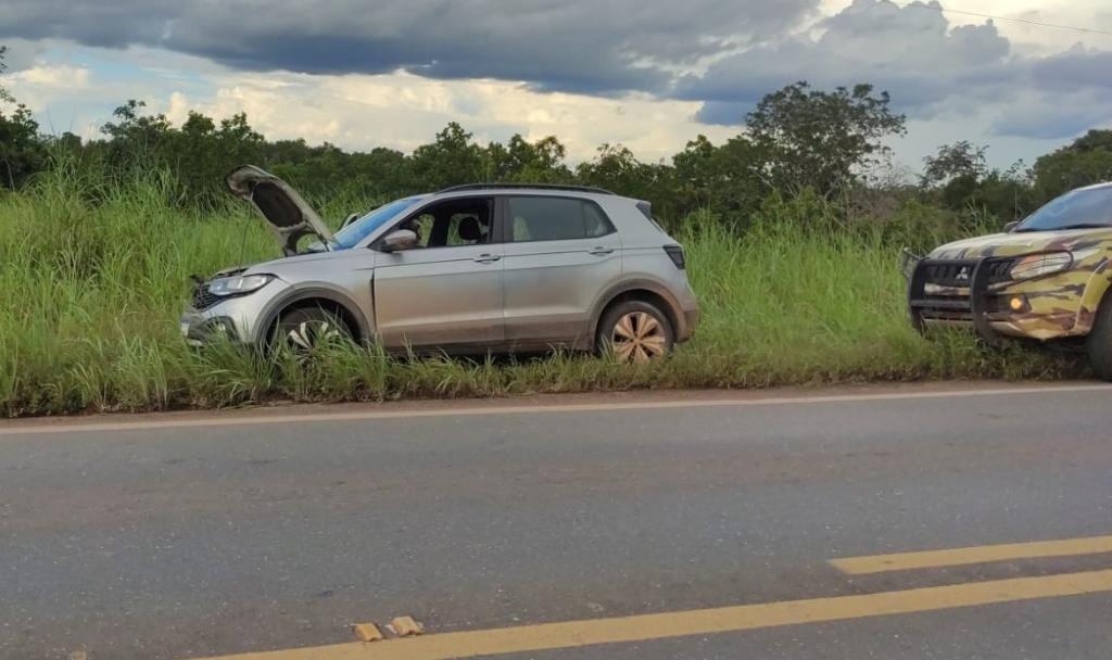 O veículo VW/T-Cross, ano 2023/2024, que possivelmente seria levado pelos criminosos para a região de fronteira, foi localizado às margens da Rodovia Helder Cândia, próximo ao distrito de Nossa Senhora da Guia, após troca de informações entre as equipes da Polícia Civil, com apoio da Patrulha Rural do 10º Batalhão da Polícia Militar.