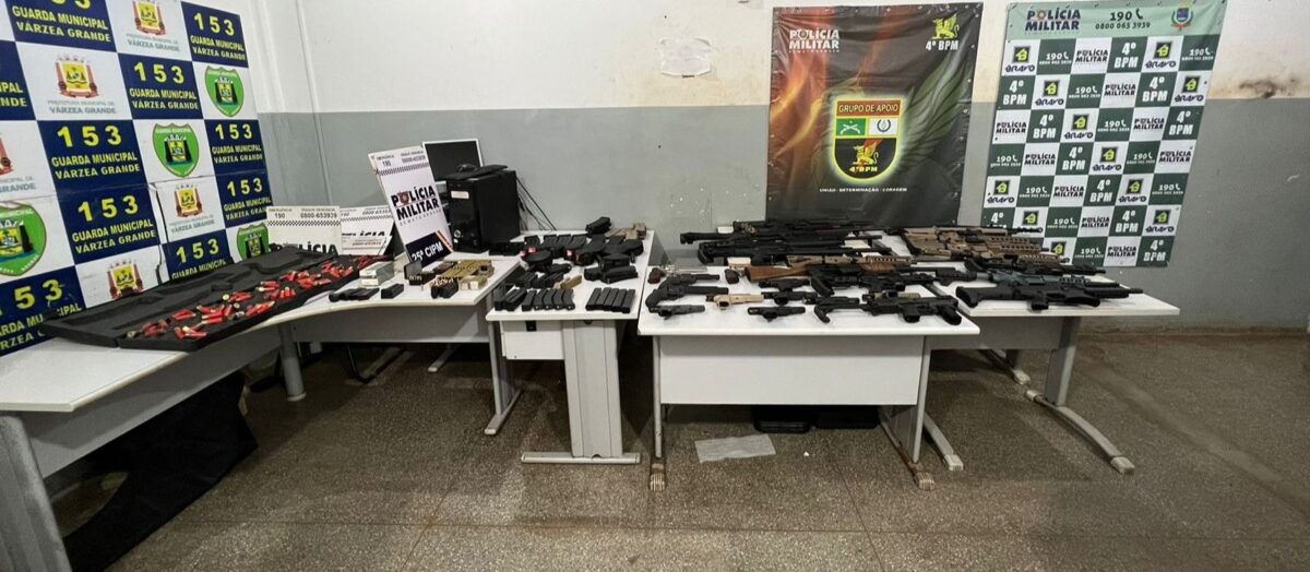 Policiais militares de Várzea Grande realizaram a maior apreensão de armas de fogo da PMMT, no ano de 2023, no final da noite desta terça-feira (15.08), no bairro Novo Mundo. Ao todo foram apreendidas 31 armas de diversos calibres, pertencentes a uma organização criminosa. Na ação, três homens, de 24, 26 e 27 anos, foram presos em flagrante.