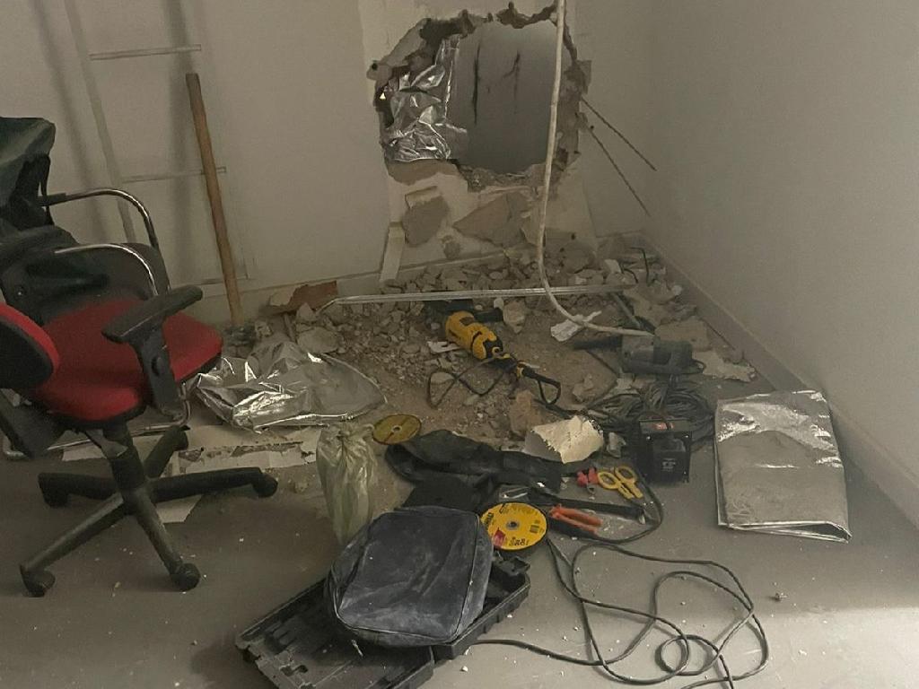 Os policiais realizaram varreduras pelo local e encontraram diversos danos à agência bancária, como paredes quebradas e cofres parcialmente cortados, além de telhas e gessos arrancados.