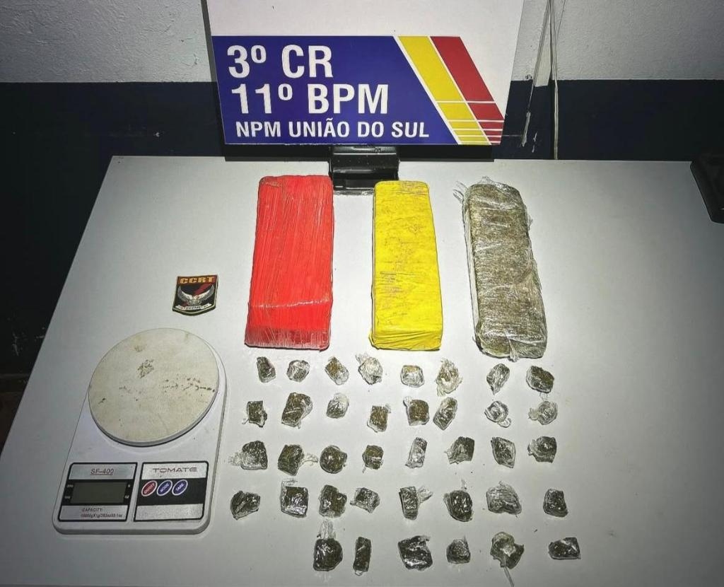 Policiais militares do 11º Batalhão localizaram, neste domingo (27.7), grande quantidade de entorpecentes enterrados em uma zona rural do município de União do Sul (629 km de Cuiabá). As equipes apreenderam três tabletes de maconha, 38 porções do mesmo entorpecente e uma balança de precisão dentro de um balde.