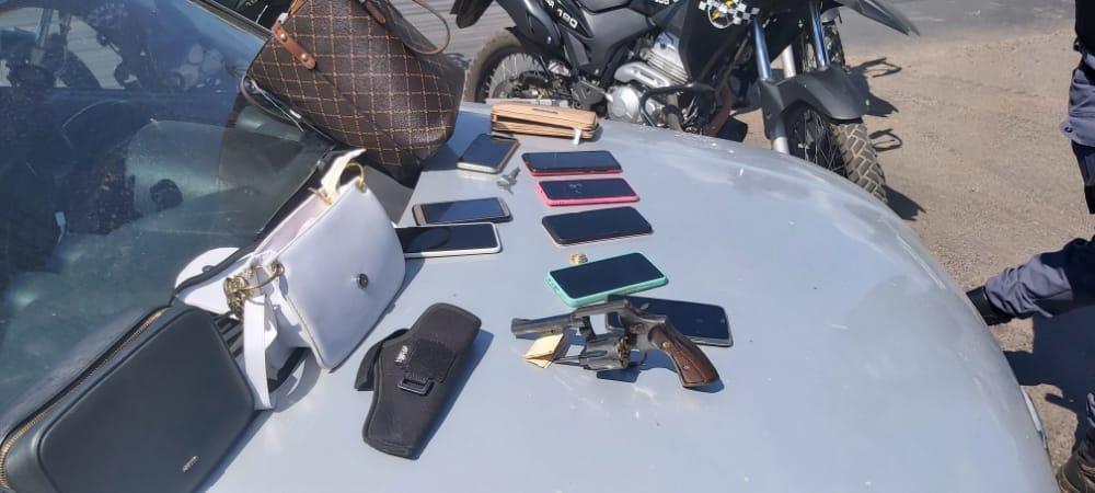 No carro, os policiais apreenderam um revólver calibre 38 carregado com seis munições, dinheiro, joias, celulares, bolsas e carteiras. A polícia identificou que a arma de fogo apreendida pertence a uma empresa de segurança. As vítimas do roubo reconheceram os suspeitos. Uma delas relatou à polícia que a quadrilha chegou a ameaçar um homem para que ele fizesse uma transferência via PIX de R$ 2,1 mil.