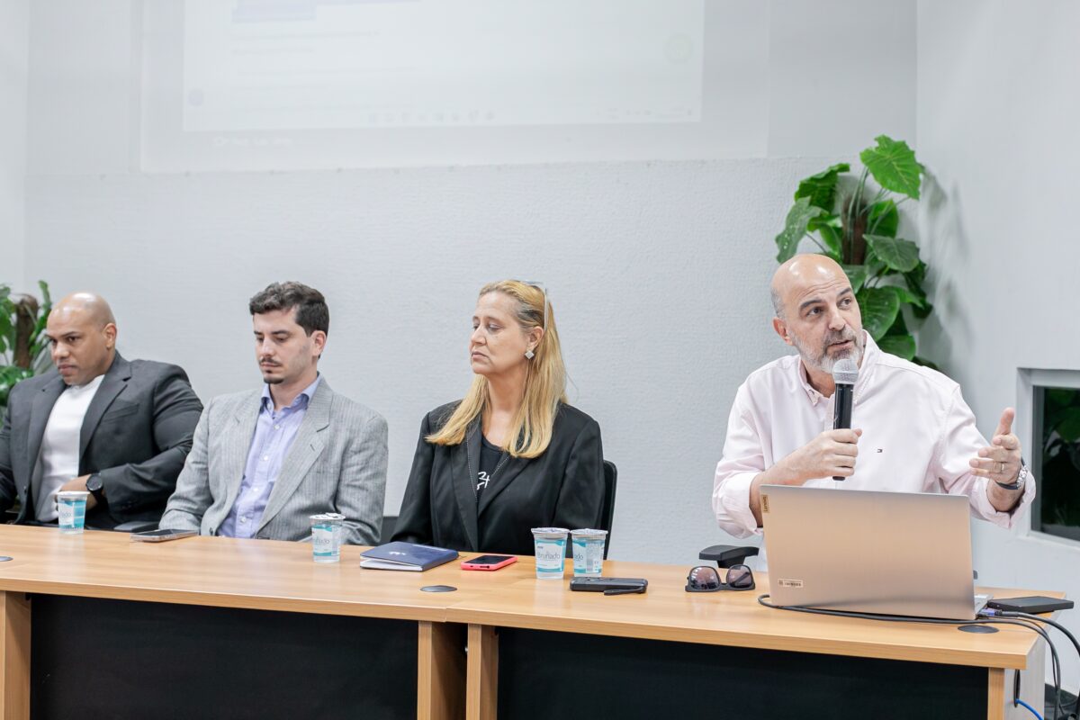 A foto ilustra o secretário Amauri Monge sentado à direita com microfone na mão. Do lado esquerdo, também sentados, está uma mulher e dois homens, todos vestidos com traje devidamente social.