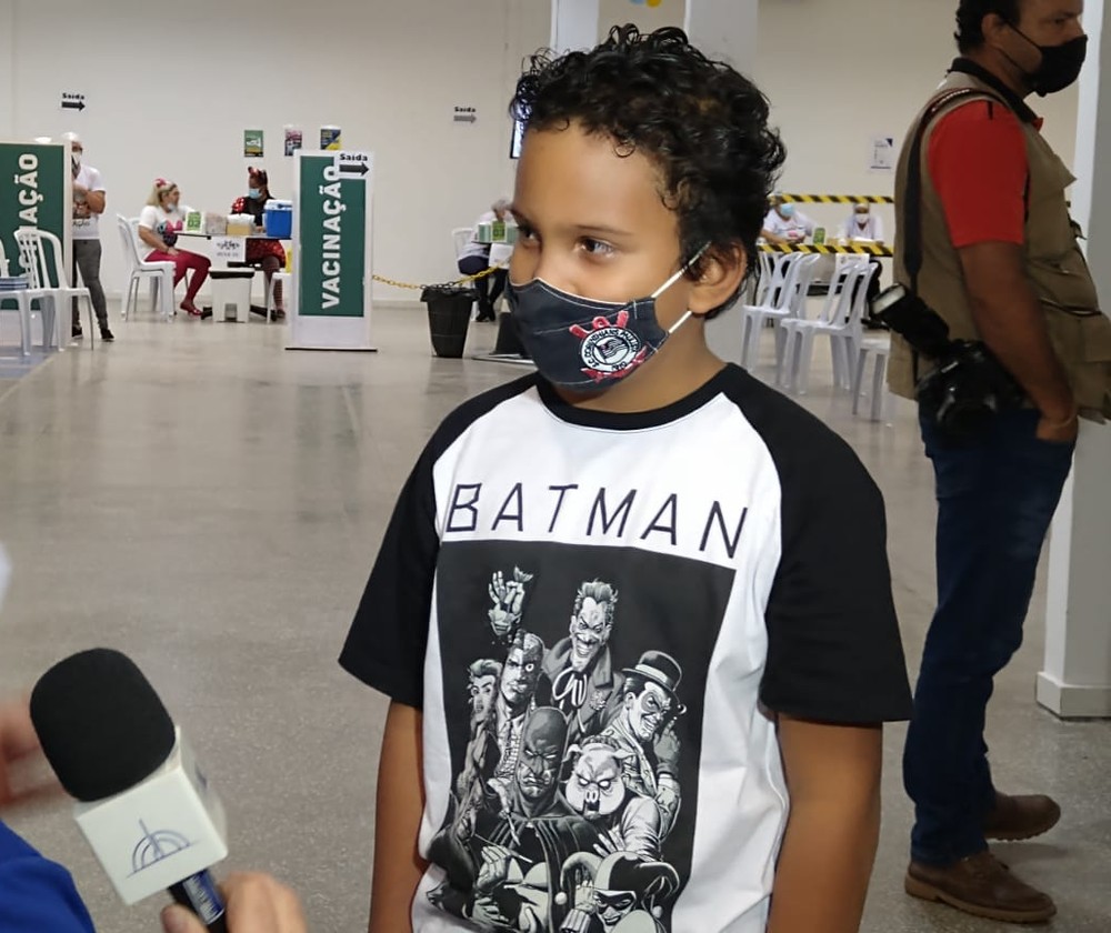 A primeira criança vacinada contra a Covid-19 em Cuiabá foi o menino Miguel Vieira Monteiro, de 9 anos, nesta quinta-feira (20), na Universidade de Cuiabá (Unic).