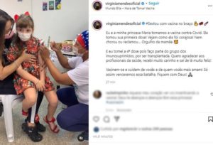 “Eu e a minha princesa Maria tomamos a vacina contra Covid. Ela tomou sua primeira dose! Vejam como ela foi corajosa! Nem chorou ou reclamou. Orgulho da mamãe. E eu tomei a 4ª dose pois faço parte do grupo dos imunossuprimidos, por ser transplantada. Quero agradecer aos profissionais da saúde, recebi muito carinho e saí de lá muito feliz!”, diz.