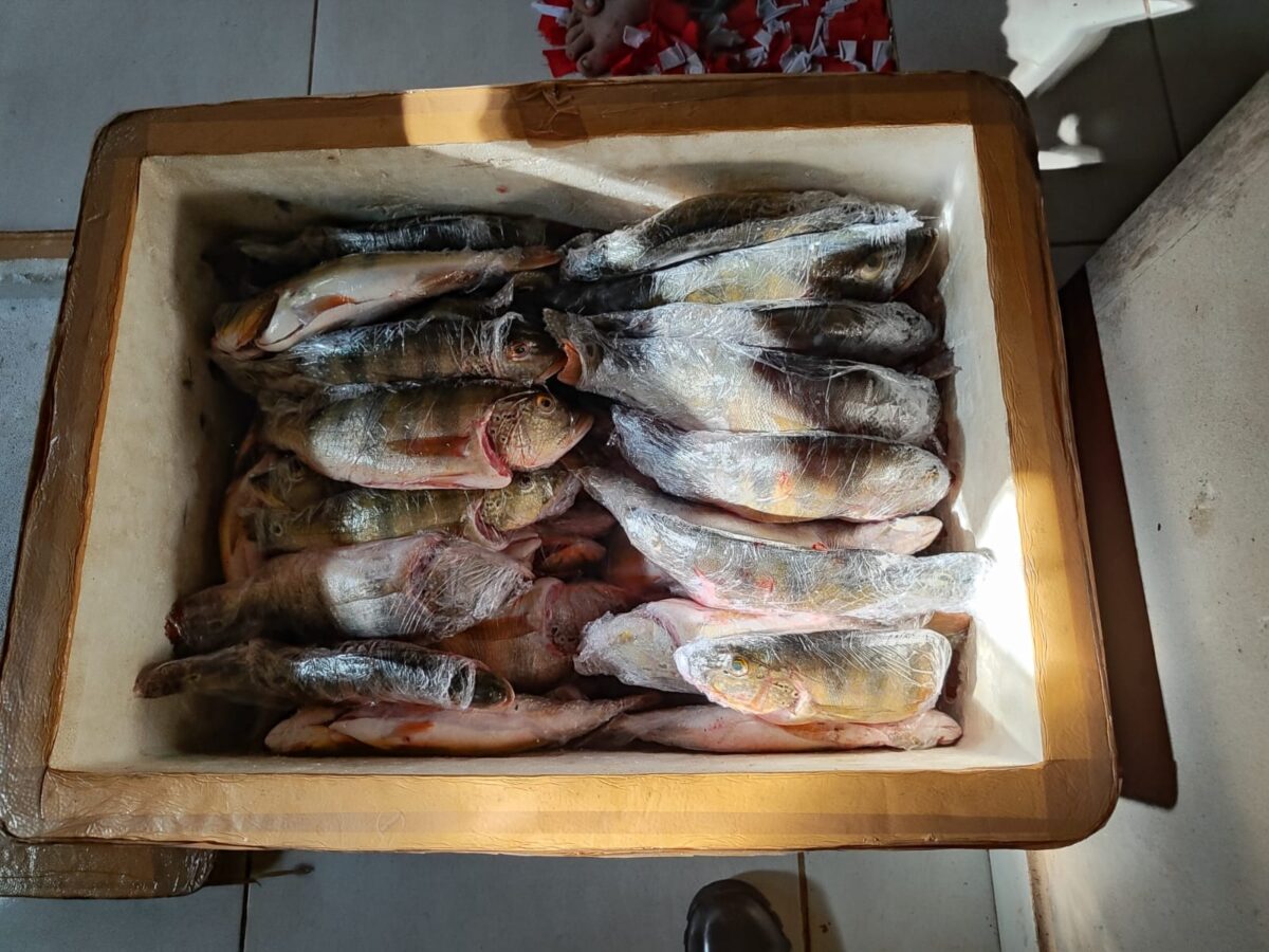 Além da quantidade elevada de pescado, foram identificadas espécies como tucunaré e barbado com medidas mínimas abaixo da permitida por lei. Duas pessoas foram conduzidas à delegacia e multadas em R$ 27.976,00.