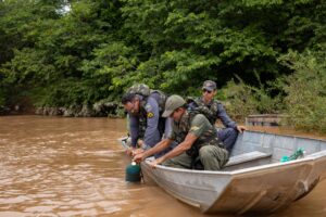 A Secretaria de Estado de Meio Ambiente de Mato Grosso (Sema-MT) realizou mais uma fase da Operação Piracema nesta terça-feira (03.12), com apoio do Batalhão da Polícia Militar de Proteção Ambiental (BPMPA), na região metropolitana do Rio Cuiabá. As equipes reforçaram o patrulhamento fluvial no combate à pesca predatória.