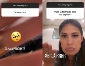 Simone Mendes, da dupla com Simaria, abriu uma caixinha de perguntas em seu Instagram nesta segunda-feira (19) e acabou ficando chateada com algumas mensagens que recebeu de seus seguidores. Uma pessoa até quis saber se a cantora já foi traída pelo marido, o empresário Kaká Diniz, com quem ela tem dois filhos, Henry, de 6 anos, e Zaya, de quase dois meses. “Sei lá”, limitou-se a responder ela.