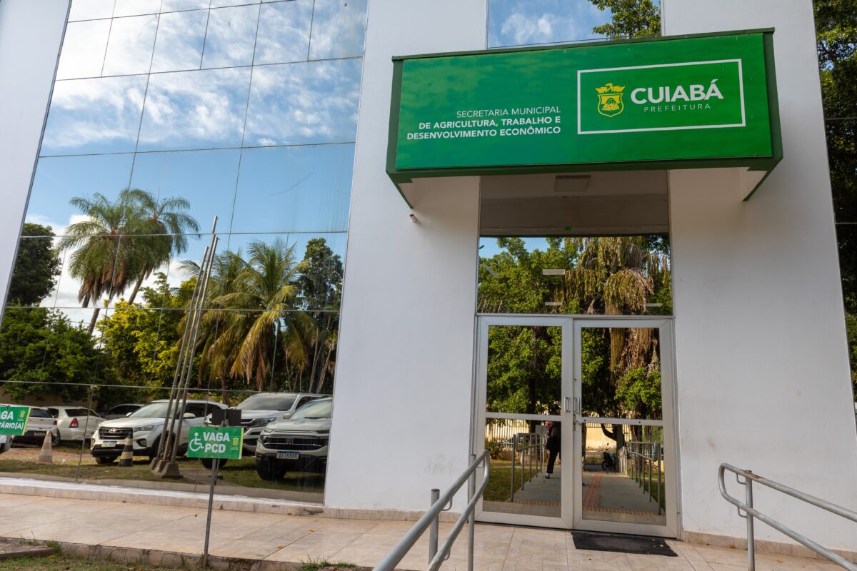 A foto mostra a fachada da Secretaria Municipal de Agricultura e Trabalho, que agora abriga também o Sine Municipal. Há uma porta de vidro e a identificação com a logo da Prefeitura de Cuiabá.