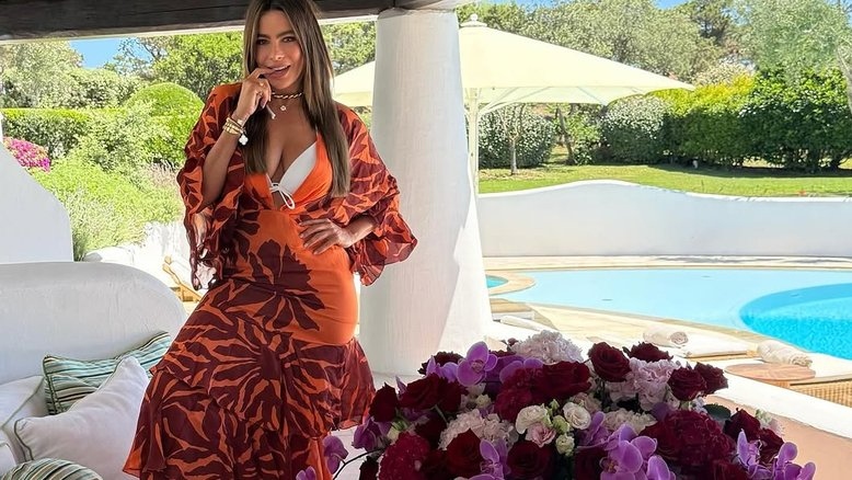 Na foto publicada em seu Instagram, Vergara aparece à beira da piscina, usando um vestido estampado laranja com decote, biquíni branco e acessórios dourados.