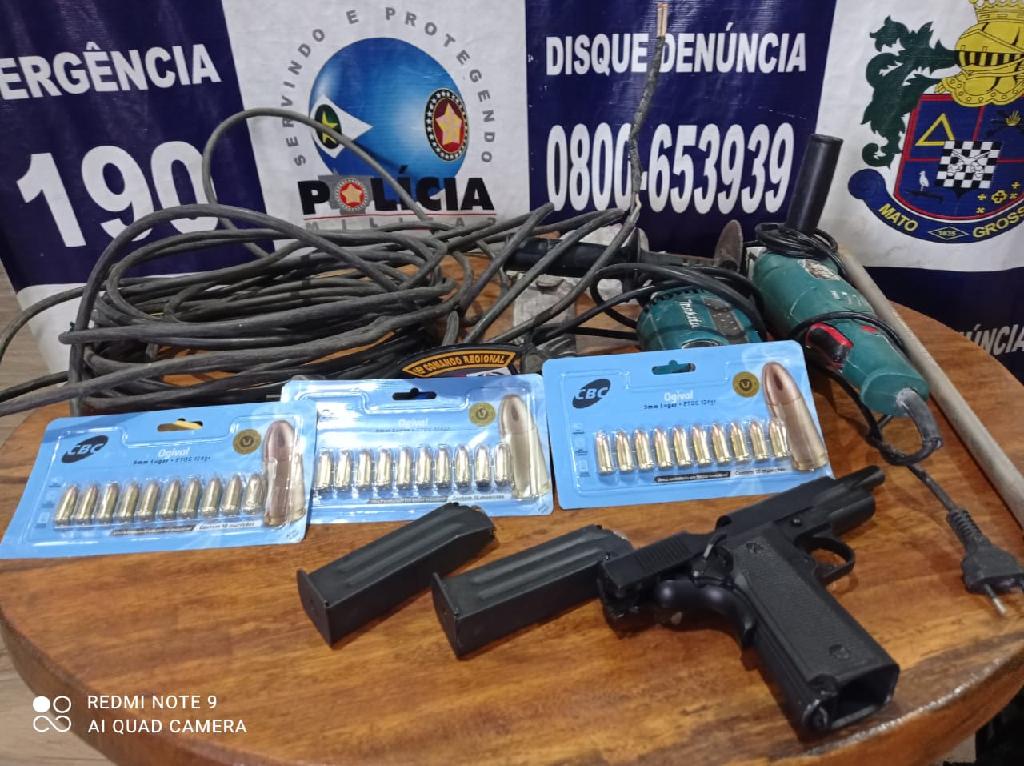 Um homem de 22 anos foi preso pela Polícia Militar portando arma de fogo em um estabelecimento comercial no distrito de União do Norte, na cidade de Peixoto de Azevedo. Na ação criminosa, que aconteceu na noite de domingo (07.11) e teve troca de tiros, foram aprendidas diversas ferramentas, além de drogas e munições.