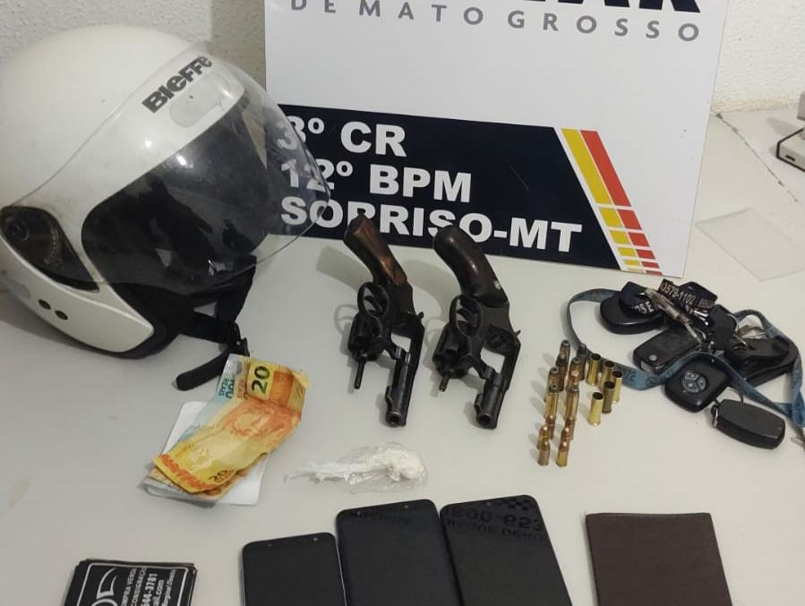 Em Sorriso, policiais do 12º Batalhão prenderam três homens por direção perigosa, porte ilegal de arma de fogo e tráfico de drogas, na noite deste domingo (05.09), no bairro Jardim Amazonas. Na ação, os policiais apreenderam dois revólveres, uma porção de cocaína e dinheiro. Um dos suspeitos era foragido da justiça.