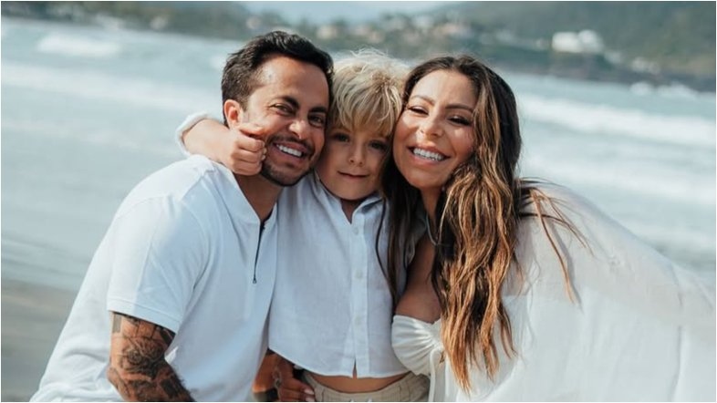 Em uma série de cliques, publicados no Feed do Instagram, no último domingo, os pais e a criança aparecem sorridentes, fazendo poses e caminhando na areia descalços.