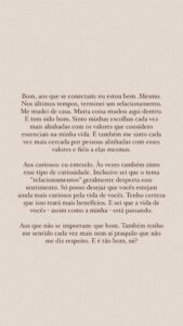 “Aos curiosos: eu entendo. Às vezes também sinto esse tipo de curiosidade. Inclusive sei que o tema ‘relacionamentos’ geralmente desperta esse sentimento. Só posso desejar que vocês estejam ainda mais curiosos pela vida de vocês. Tenho certeza que isso trará mais benefícios. E sei que a vida de vocês – assim como a minha – está passando”, acrescentou.