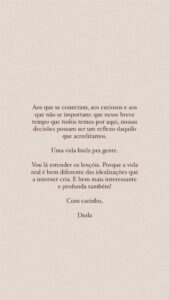Duda ainda fez uma reflexão: “Aos que se conectam, aos curiosos e aos que não se importam: que nesse breve tempo que todos temos por aqui, nossas decisões possam ser um reflexo daquilo que acreditamos. Uma vida linda pra gente. Vou lá estender os lençóis. Porque a vida real é bem diferente das idealizações que a internet cria”, concluiu.