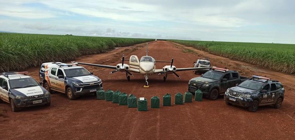 Os policiais viram o momento em que um veículo fugiu na pista de voo da fazenda e os ocupantes abandonaram algo no canavial.