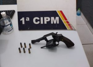 Os três suspeitos localizados, sendo dois homens e uma mulher, foram abordados e flagrados com um revólver calibre 38.