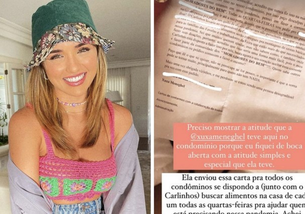 “Ela enviou essa carta pra todos os condôminos se dispondo a (junto com o Carlinhos) buscar alimentos na casa de cada um todas as quartas-feiras pra ajudar quem está precisando nessa pandemia. Achei tão genial (desculpe postar assim Xuxa), mas não queria deixar passar essa inspiração e dizer o quanto você foi extraordinária nessa atitude”, continuou Rafa.